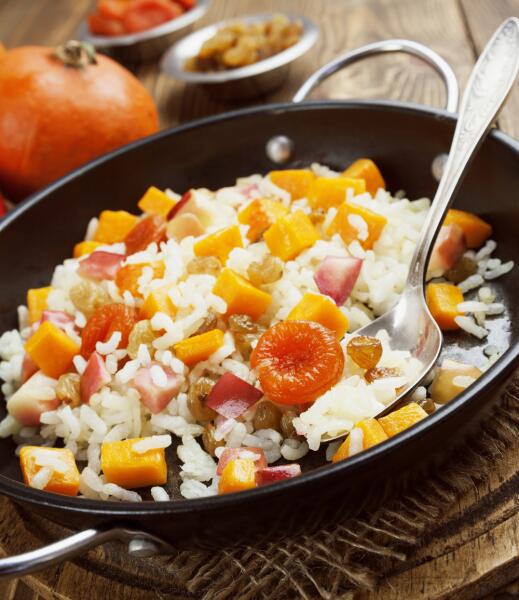- На дно кастрюли налить растительное масло. Выложить слой нарезанной тыквы. На нее насыпать слой промытого риса, затем снова выложить слой тыквы. Далее выкладывать слоями: рис – фрукты – тыква – рис. Заполнить кастрюлю. Верхний слой полить растительным маслом.
