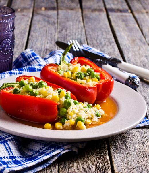 Нафаршировать перец овощной начинкой, накрыть крышечками. Выложить в форму, залить томатным соусом, смешанным с 0,5 стак. воды, запекать 30 мин в духовке при 180 °С. Готовый перец выложить на блюдо, посыпать зеленью петрушки или укропа, подавать как в горячем, так и в холодном виде.