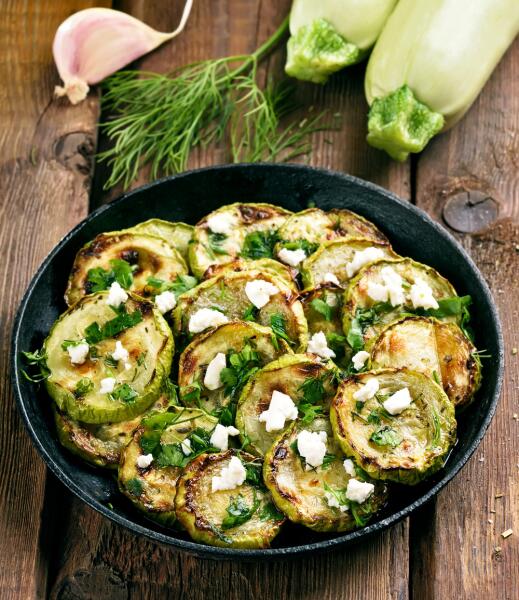 2. На противень выложить цукини, наполнить их гречкой с овощами. Запекать в духовке 25–30 мин. Готовые цукини выложить на блюдо, украсить помидорами и укропом.