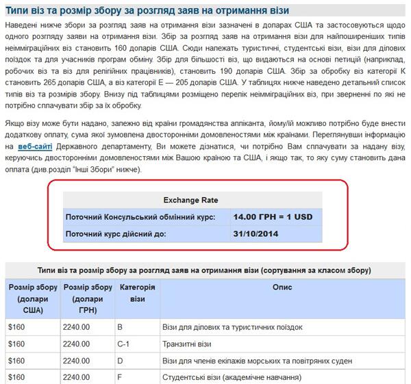 Вот, к примеру, по какому курсу взимает плату за свои услуги посольство США. 14 гривен за доллар. Никаких заигрываний с властями Украины.