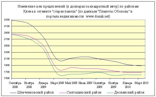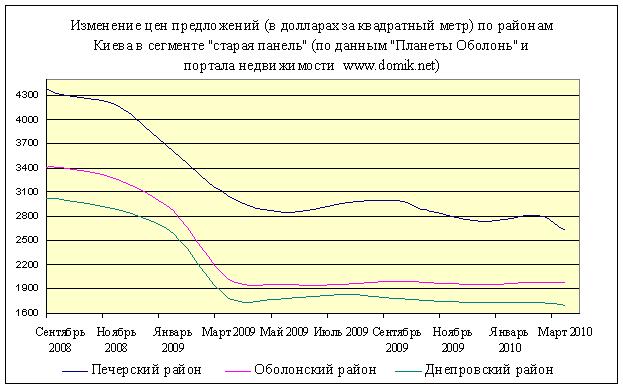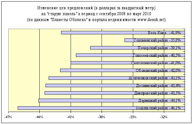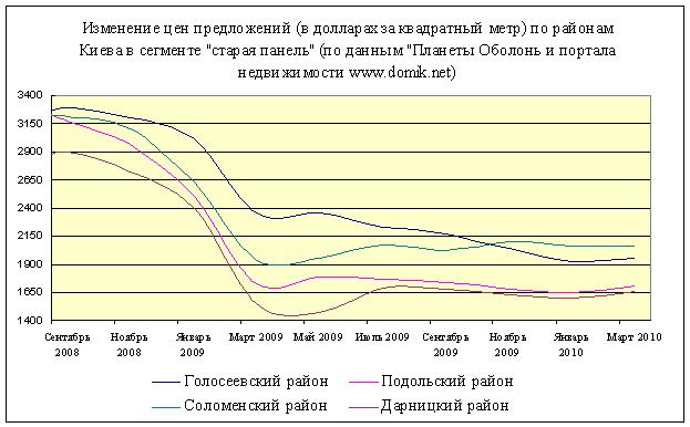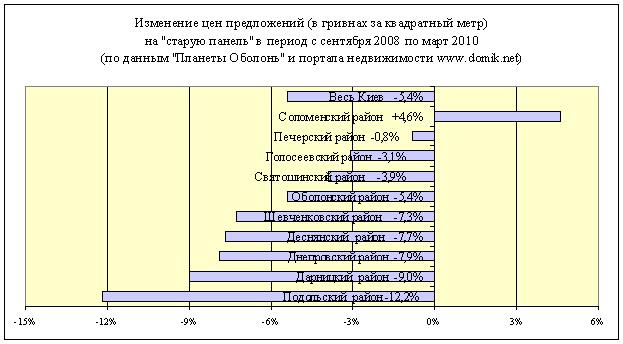 . В период с сентября 2008 по март 2010 цены предложений на «старую панель» в Киеве снизились на 5,4%. Максимальное снижение зафиксировано в Подольском районе (-12,2%). В Соломенском районе цены предложений повысились на 4,6%.