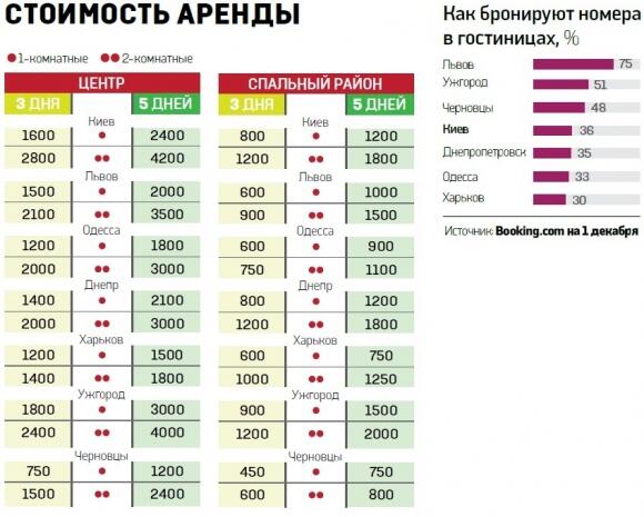 «Львов, пожалуй, спрашивают даже чаще Киева. Есть спрос и на Крым, однако тамошние хозяева не спешат сдавать — хотят гостей минимум на 10 дней, а наши едут не больше чем на пять», — рассказала «Вестям» оператор dobovo.com.ua Инна. Хозяева квартир Харькова и Днепропетровска в основном рассчитывают на земляков.