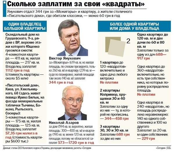 Чиновники и эксперты уверяют, что нововведение не ударит по карманам простых украинцев, а коснется в основном лишь состоятельных людей и тех, в чьей собственности числится от двух квартир. Редакция «Сегодня» решила посчитать, сколько заплатят за свои хоромы наши вип-чиновники – президент и премьер . Напоминаем, что налогом облагается только жилая площадь квартиры или дома.