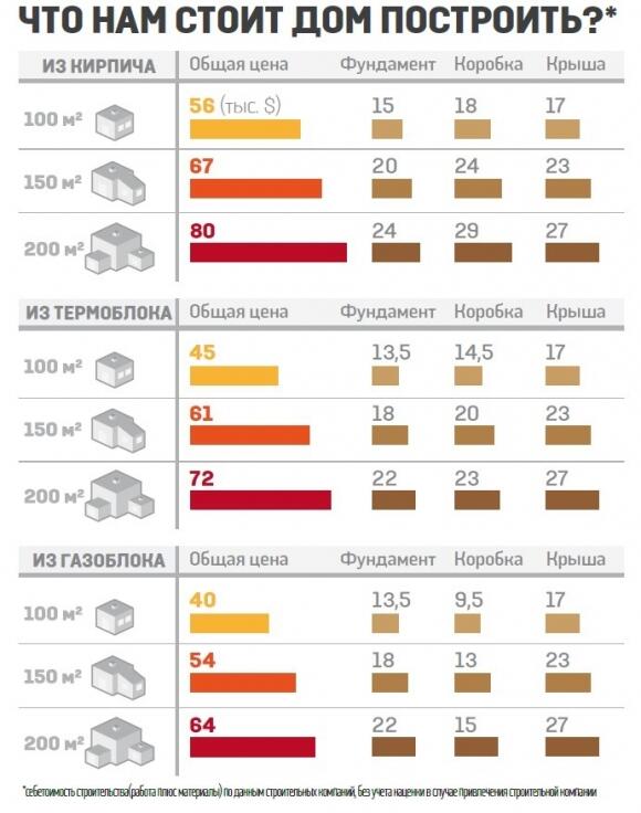 «Себестоимость кирпичного дома площадью 100 метров — 588 тыс. грн, то есть примерно $50 тыс.», — подсчитал Анатолий Патлай. Покупатель заплатит за такой дом вдвое больше — $100 тыс. Хотя кирпич — самый дорогой вариант строительства и стоимость кв м стены обойдется в 600 грн/кв. м, он еще и самый надежный: прочный, «дышит» (летом прохладно, а зимой тепло), проверен в эксплуатации.