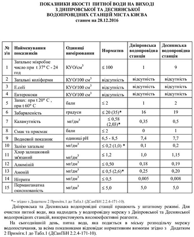 На выходе из Днепровской и Деснянской водопроводных станций Киева, были зафиксированы показатели качества воды.