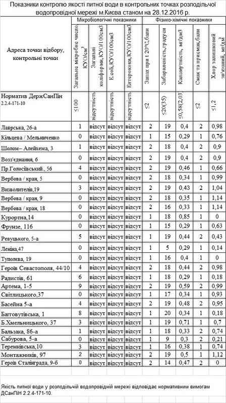 ПАО АК «Киевводоканал» опубликовала сведения о качестве водопроводной воды по состоянию на конец декабря 2016 года.
