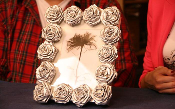 Из газеты можно сделать потрясающую рамку для фотографии. Для этого нужно накрутить из неё полоски, свернуть их в виде роз и покрасить в любой цвет.