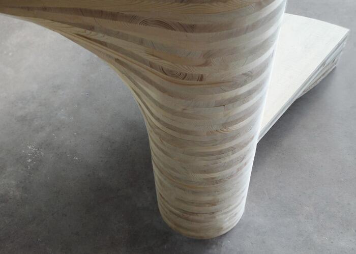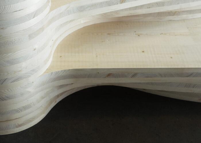 Дощатые сегменты одинаковой формы и размера собраны в скульптурный объект, который представляется монолитным при определенном ракурсе.