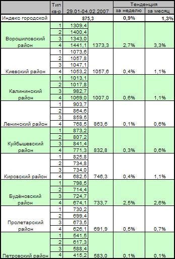 За первую неделю февраля 2007 года цены на вторичную недвижимость в Донецке выросли на 0,9%. За январь 2007 года цены выросли на 1,3%.