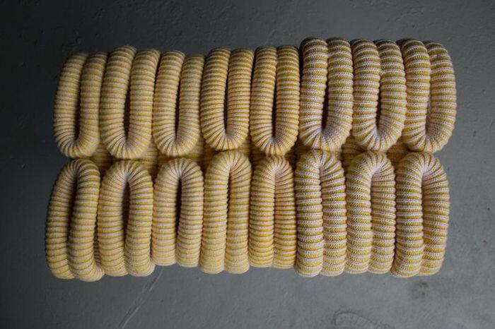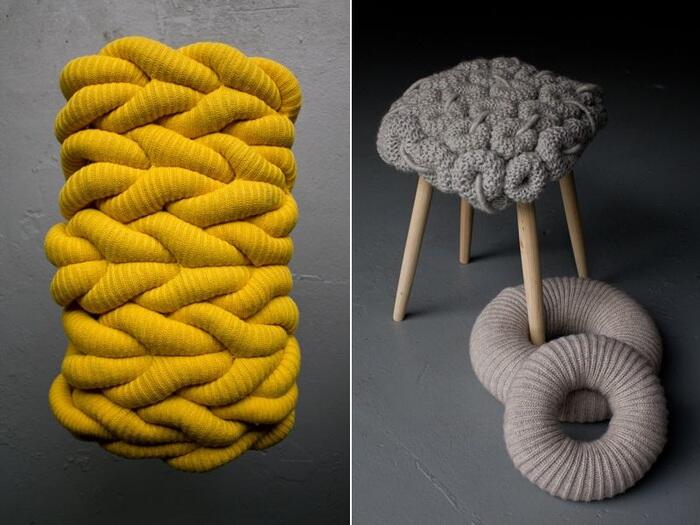 Дизайнер из Лондона Claire-Anne O’Brien предложила свой вариант вязаной моды, но не для людей, а для табуреток. Уютные, мягкие и красивые сидения выполнены из натуральной пряжи. Они наверняка внесут теплую нотку в интерьеры вашей кухни или прихожей.
