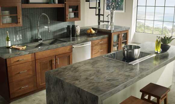 Альтернатива листовому камню – так называемый «жидкий камень». Материал изготавливается точно по форме изделия, т.е. его производство безотходное. В случае со столешницей на поверхности изделия выставляется опалубка, внутрь с помощью специального оборудования наносится в 3 слоя цветной камень, добавляется слой стеклоткани, все заливается акриловой смолой, дополняется двумя листами МДФ и повторно заливается смолой. Изделие переворачивается лицевой стороной вверх, шлифуется и полируется.