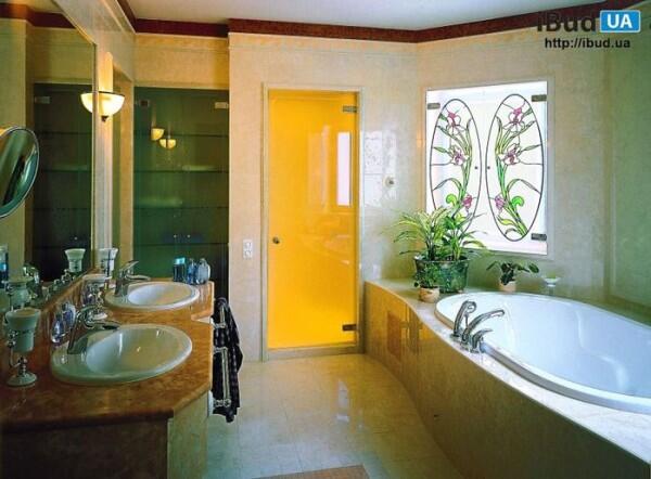 Двери для ванной комнаты бывают как с остеклением так и глухими. На сегодняшний день довольно актуальны витражные остекления дверей.