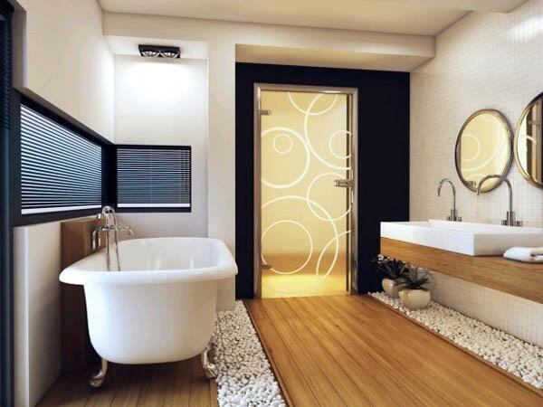 И так, какие же конструкции подходят под определение — влагостойкие. Во-первых это, популярные на сегодняшний день стеклянные двери . Не думайте, что такая конструкция не подойдет для такой интимной комнаты, как ванная. Стеклянные изделия бывают расписными настолько или тонированными, что ничего, сквозь них не разглядишь, кроме тусклого света. Для ванной комнаты подойдут как откатные, так и распашные стеклянные двери. Преимущество стеклянного изделия в том, что оно вписывается практически в любой дизайн и не смотреться инородным элементом, особенно если остальные двери в квартире, тоже остеклены.