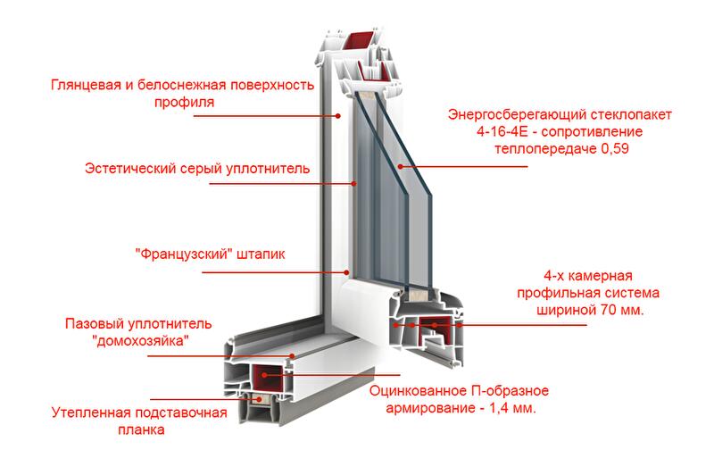 Дополнительный запас прочности конструкции обеспечивает использование квадратного оцинкованного армирующего профиля толщиной 1,4 мм. Поэтому он может применяться для создания окон довольно большого размера.