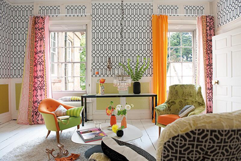 Обои с геометрическим (графичным) рисунком позволят привнести гармонию в интерьер дома, хозяин которого предпочитает лаконичность, прямоту, игру линий и фигур романтическим. Так, обои для стен в клетку часто используются в классическом убранстве комнат. Мысленно замените эти стены на однотонные – и вы увидите, как много души потеряет интерьер. Клетка – очень хороший и уютный рисунок и для обоев, и для текстиля. Обои для стен с рисунком в виде ромбов визуально расширяют комнату. — осветлить «темное» помещение можно, оклеив самую неосвещенную стену обоями такого же цвета, но на тон-два светлее.