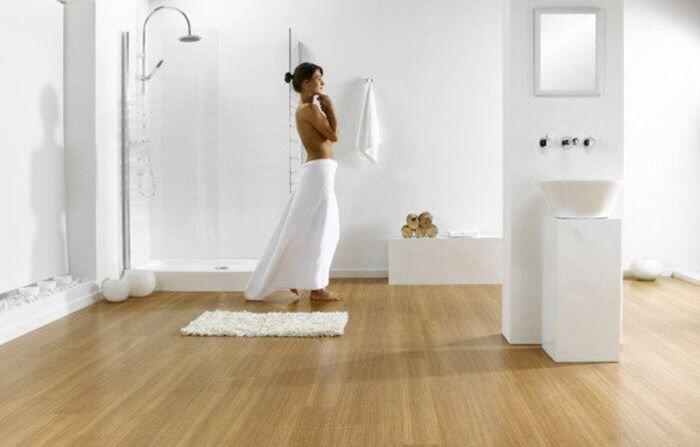 Но если классический вариант с кафельной плиткой для вас слишком традиционен, то обратите внимание на ламинат. Не пугайтесь этой идеи! Времена, когда ламинат набухал при небольшом попадании влаги, уже прошли, появились новые виды напольного покрытия — влаго-, водостойкие и водонепроницаемые.