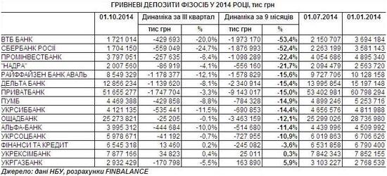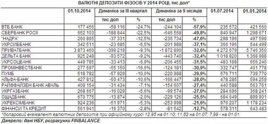 За даними НБУ, у третьому кварталі 2014 року обсяг гривневих депозитів населення у банківській системі зменшився на 6,5%, за дев'ять місяців - на 18%. Портфель валютних вкладів фізосіб за липень-вересень 2014 року зменшився на 10,3%, за січень-липень - на 33,6%.