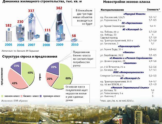 Сейчас в Харькове выставлено на продажу 49 новостроек, 17 из которых уже сданы в эксплуатацию, другие находятся на разных стадиях строительства. Уловив тенденцию активизации спроса, многие подрядчики, заморозившие объекты в начале кризиса, возобновили работы. «Если в прошлом году было приостановлено строительство до 80% объектов, то сейчас 40–60%», — отмечает Игорь Балака. Но, учитывая боязнь граждан прогореть на недострое, основные продажи ведутся в 20–25 домах, которые либо уже сданы в эксплуатацию, либо близки к этому (дома эконом-класса на ул. Грековской, Целиноградской, просп. Жукова, Гагарина, Победы, жилищный комплекс на пл. Восстания). По информации компании «Крона», в минувшем году в Харькове было сдано 360 тыс. кв. м жилья, в этом — менее 60 тыс. кв. м. Непроданными на сегодняшний день остаются порядка 150 тыс. кв. м, чего явно недостаточно даже для кризисных потребностей города, особенно если учесть, что структура предложения за последние три месяца резко изменилась и уже не соответствует потребностям рынка. Доля недорогого жилья упала с прошлогодних 60 до 40%, тогда как доля бизнес-класса, наоборот, выросла с 35 до 45%. Последние продаются не так хорошо, как того хотелось бы застройщикам, из-за большой площади квартир («единичка» — 70–100 кв. м) и высокой стоимости квадрата (от 9,1 тыс. грн.). Ведь цены в некоторых объектах премиум-класса стартуют с 10 тыс. грн./кв. м.