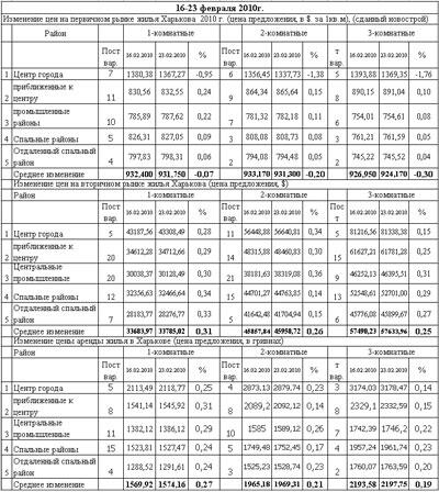 За период с 15 по 21 февраля 2010 года средняя цена продажи 1-3 комнатных квартир на вторичном рынке в Харькове выросла на 0,25% ($2) до $948 за 1 кв. м. При этом самым дешевым оставался Орджоникидзевский район, со средним показателем $810/кв.м., самым дорогим Киевский район, где средняя цена продажи составила $1162/кв. м.