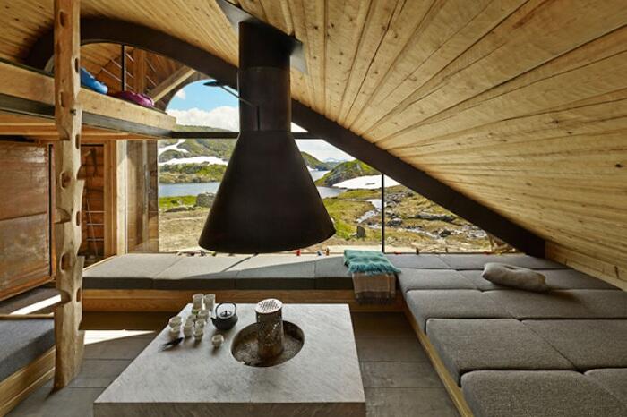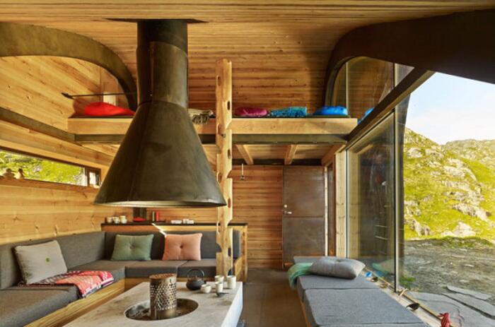 Внутренняя организация жилого пространства. Отдавая дань традициям, архитекторы организовали внутреннее пространство Hunting Lodge вокруг камина. На прямоугольных диванчиках можно разместить до 20 гостей, притом, что общая площадь домика составляет всего лишь 35 квадратных метров! Дополнительное спальное место обустроено над головой, куда можно подняться по своеобразной лестнице, вырезанной из деревянного столба.