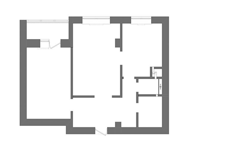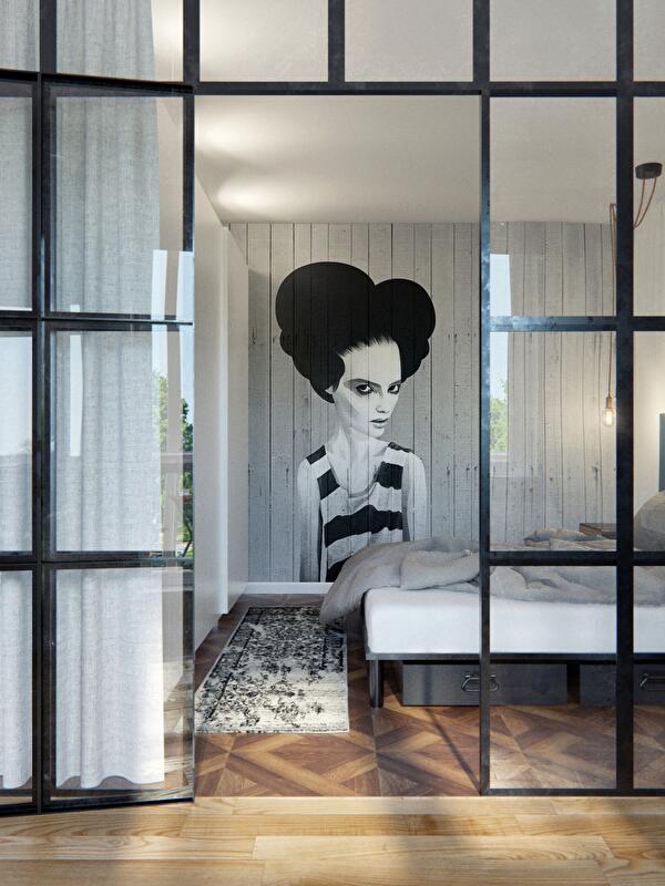 Существующие ненесущие перегородки планируется демонтировать. Планировочное пространство квартиры сохранено открытым, изолированы лишь зоны спальни и санузла. Спальня ограничена стеклянной перегородкой, которая обеспечивает доступ солнечного света в помещение.