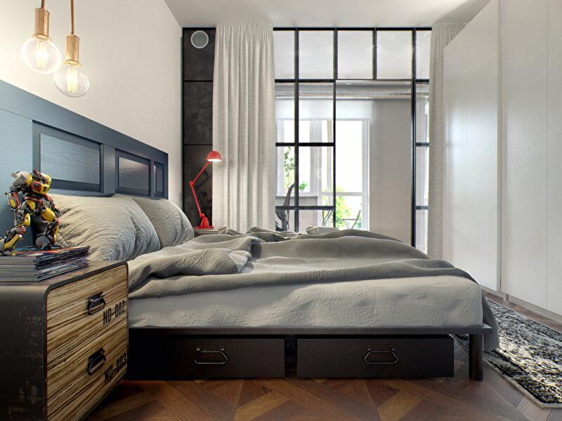 Многие предметы мебели в квартире планируется сварить из металлического профиля: тумба в гостиной, барная полка, обеденный и журнальный стол. И это не единственные индустриальные элементы в данном проекте: открытые воздуховоды, дверь в качестве изголовья кровати, старая доска на стене спальни с граффити, перегородка из двух видов пустотелого кирпича между гостиной и прихожей, стеклянная перегородка в спальне.