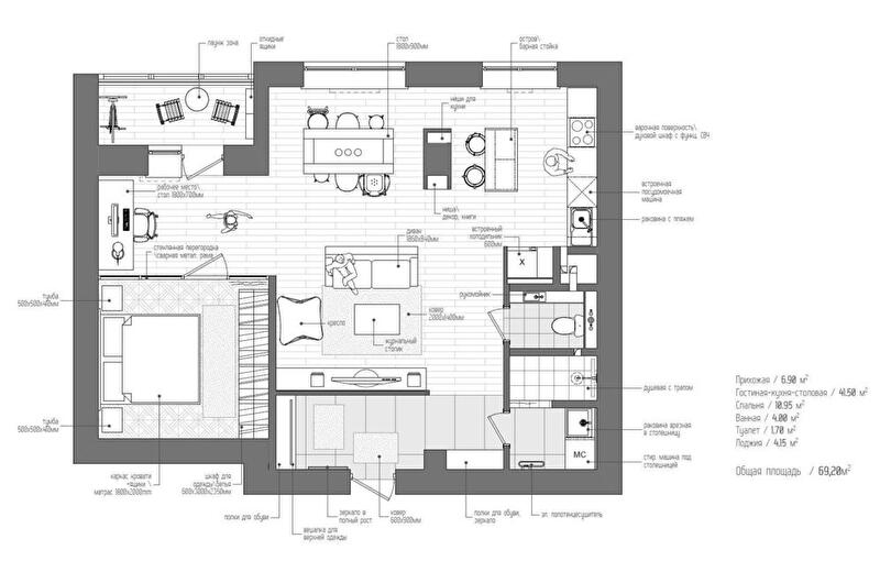 Следуя принципам антикафе, в ходе перепланировки дизайнеры студии INT2 Architecture создали свободное от лишних стен пространство. Изолированными авторы проекта оставили только зоны санузла и спальни, отделив последнюю стеклянной перегородкой – получилась современная и модная планировка, идеальная для жизни заказчика – 26-летнего молодого человека. За домашний уют, характерный для антикафе, здесь отвечают скандинавские мотивы, а за молодежную обстановку – многочисленные индустриальные элементы.
