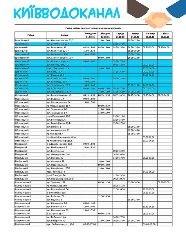 Мешканці Дніпровського району для укладення договору з Київводоканалом тепер мають можливість звертатися не лише за адресою: вул. Харківське шосе, 50-А, але й обрати для себе більш зручні за розташуванням Центри – з 1 серпня прийом громадян здійснюється також по вул. Рогозівській, 4/16; вул. Регенераторній, 4; вул. Пожарського, 8-А та пров. Г.Хоткевича, 2-А.