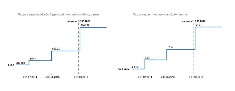 5 травня НКРЕ ухвалила новий тариф для "Київенерго" — 1345 грн/Гкал за наявності лічильників обліку і 31,3 грн за кв м в місяць опалювальної площі - якщо немає квартирних або будинкових лічильників (зростання відповідно на 104% і 93%).
