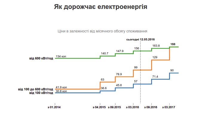 Зростають ціни для населення не тільки на газ, а й на електроенергію. П'ять етапів підвищення були затверджені ще на початку 2015 року. Ми вже пройшли три з них. Залишилося два — з 1 вересня2016 року і з 1 березня 2017 року.