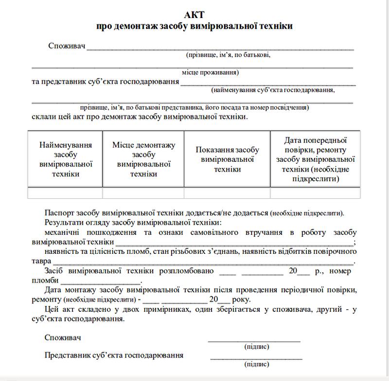 Портал Domik.ua дізнався, яка інформація має бути вказана в акті демонтажу. В документ вносяться дані про власника квартири, особу, яка проводить демонтаж, та, головне, сроки виконання повірки та монтаж приладу.