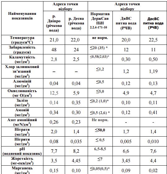 Показники якості води річок Дніпра та Десни та питної води на виході з Дніпровської та Деснянської водопровідних станцій Києва.