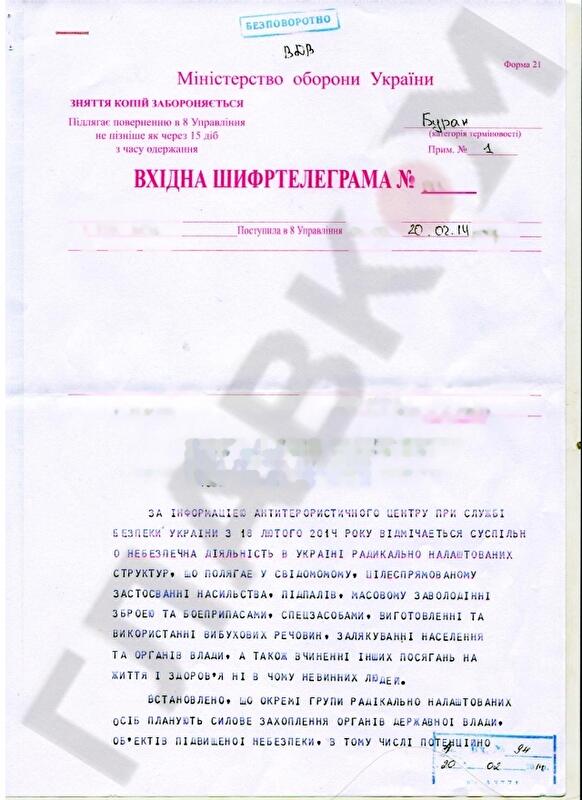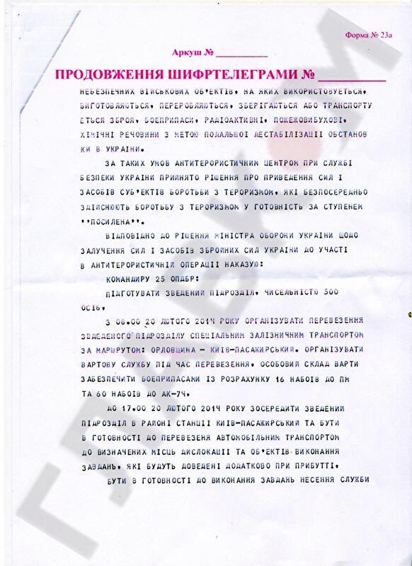 У розпорядженні «Главкому» є ряд шифрограм, розісланих 20 лютого підрозділам української армії за підписом Ільїна, які підтверджують план армійської верхівки кинути військових для придушення революції і розгону Майдану. В тому числі – із застосування зброї.