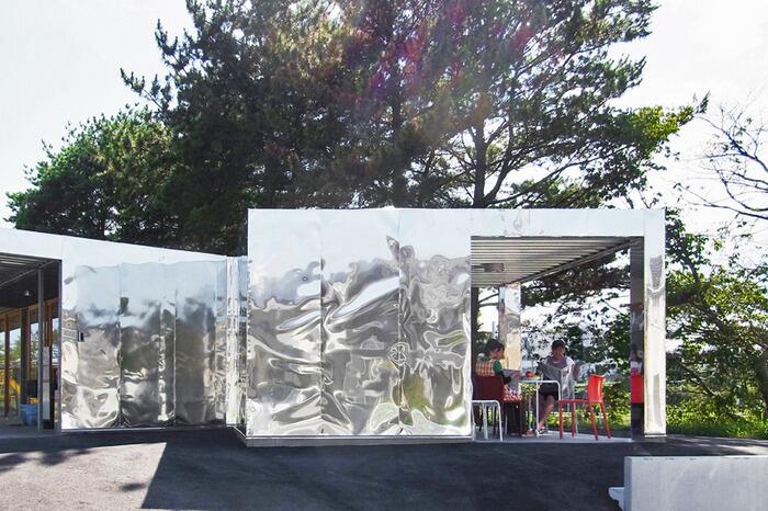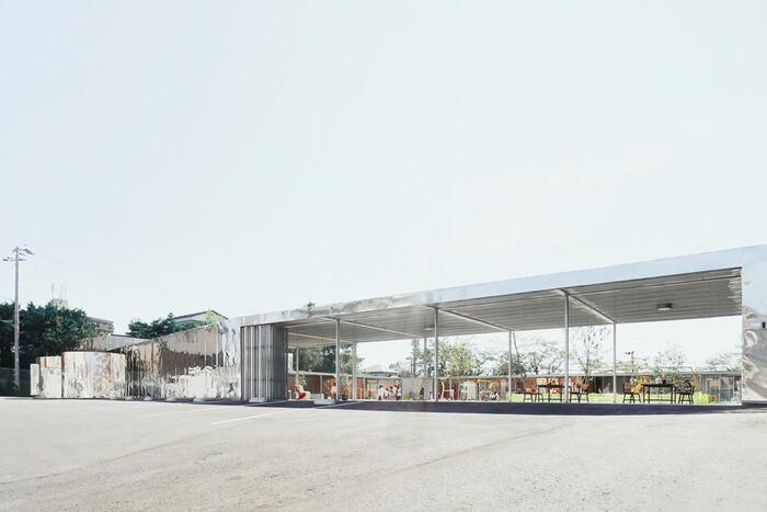 В качестве фасадной отделки архитектор выбрал отражающие металлические панели, тем самым сознательно ломая стереотипы относительно дизайна детских учебных учреждений.