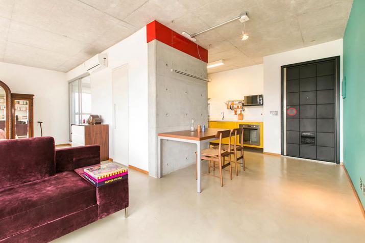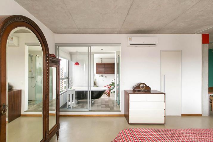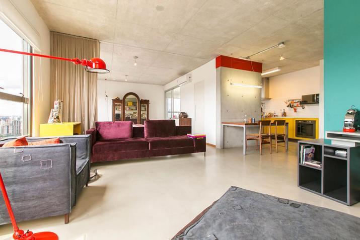 Квартира находится в Сан-Паулу (Бразилия) и принадлежит юристу, который пока не обзавелся ни семьей, ни детьми. Поэтому студийная планировка оказалась подходящей, тем более, такое решение позволяет зрительно увеличить пространство. Все комнаты плавно перетекают одна в другую, за глухой стеной скрыт лишь санузел, а спальная зона отделяется от гостиной в случае необходимости с помощью плотной шторы. Яркие брызги красок перемежаются с нейтральной цветовой гаммой: серые оттенки смешаны с красными, желтыми и голубовато-зелеными. Владелец недвижимости любит принимать ванну, поэтому купель в викторианском стиле была его обязательным условием. Ее расположили напротив окна, чтобы он имел возможность полноценно отдыхать и наслаждаться видами Бразилии во время купания.