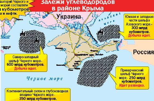 Теперь давайте подсчитаем, что потеряет Украина, если Крым уйдет в "одиночное плавание". Черноморский шельф, по разным оценкам, содержит минимум 1 триллион кубометров газа. Если учесть, что наша страна в прошлом году потребила 50 миллиардов кубов, несложно вычислить, что там хранится минимум 20-летний запас топлива. И речь идет только о разведанных запасах. По самым оптимистическим оценкам, на шельфе может быть до 3,5 трлн кубометров. Этого газа нашей стране хватило бы минимум на 70 лет.
