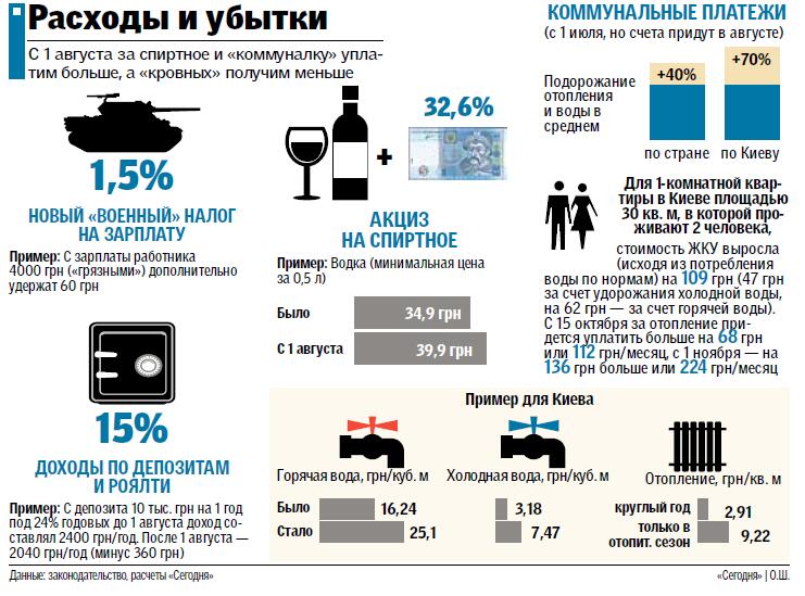 Также из-за увеличения акцизов в августе бутылка водки подорожает до 40 грн, проценты по депозитам и роялти (доход от авторских прав) обложат налогом в 15%, а украинцам придется больше платить за «коммуналку» по июльским счетам, которые начнут приходить после 1 августа — ведь, напомним, с 1 июля подорожали ЖКУ (подробнее см. инфографику).