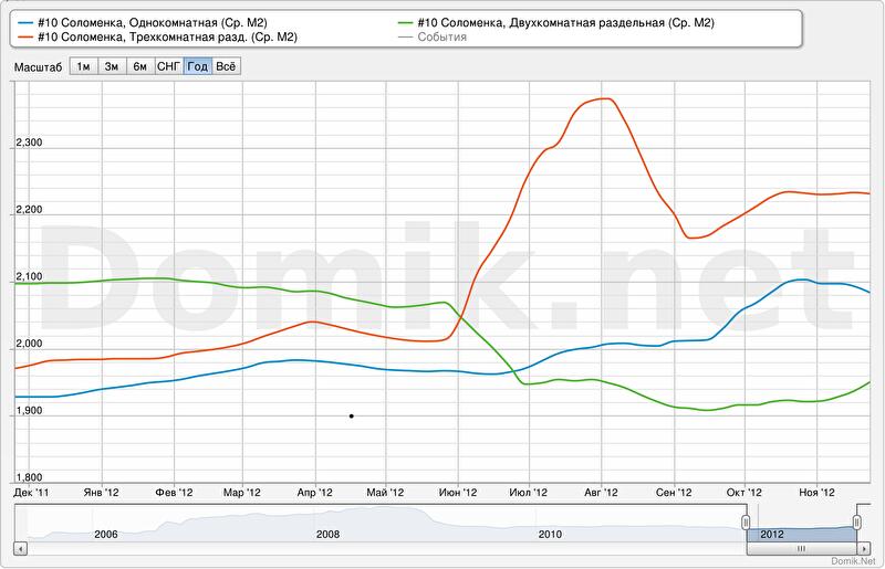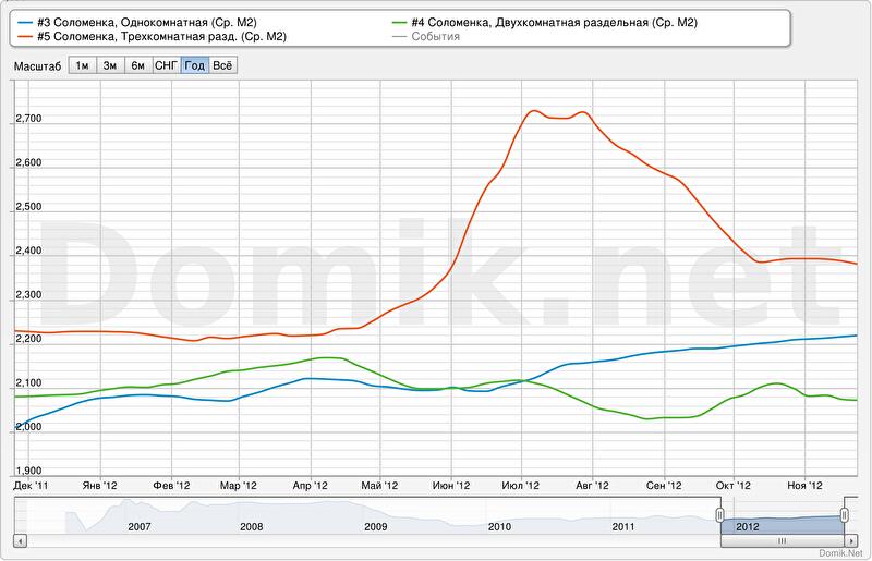 Итак, мы видим, что цена на квартиры в старом жилом фонде Соломенки либо остается неизменной, либо падает. Ввиду этого, напрашивается вывод, что общее подорожание происходит за счет новостроек. Рассмотрим подробнее этот сегмент.