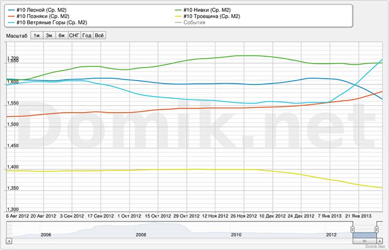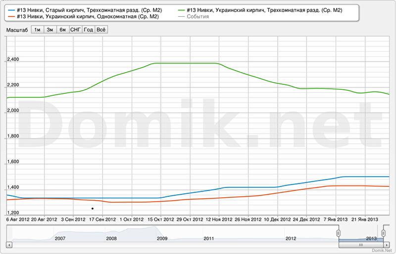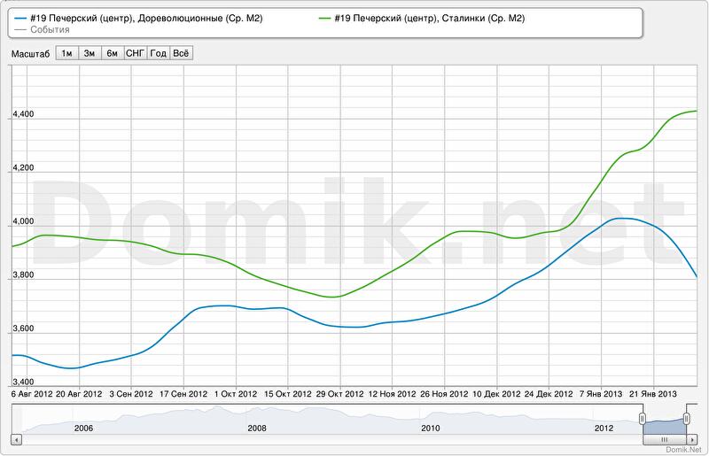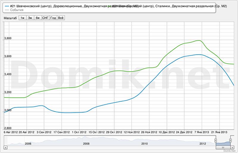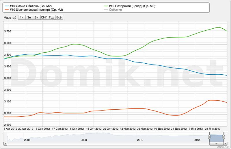 Если в целом в 2012 году отмечался рост цен на квартиры на Троещине , Лесном, еще нескольких жилых массивах на окраине, а также в Оазисе , то при рассмотрении динамики за август 2012 — январь 2013 года, получаем совершенно иную картину. За последние полгода наиболее заметный рост наблюдается в центральной части Печерского и Шевченковского районов, на Демеевке, Нивках, Ветряных горах и Позняках. В то же время, Троещина, Лесной и Оазис в цене упали.