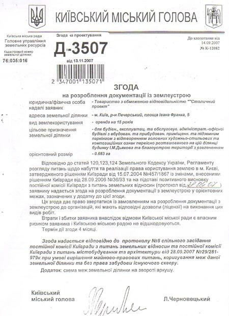 За інформацією депутата, у 2007 році Київрада дала дозвіл на розробку документації для забудови парку Франка за адресою площа Івана Франка, 5, “не повідомивши ні громадськість, ні Печерську районну раду”.