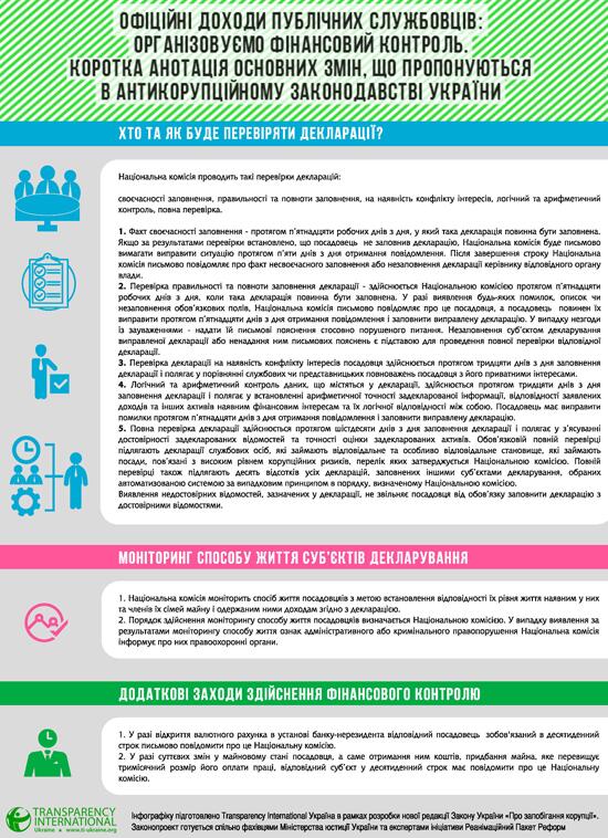 Таким чином, цей попередній захід спрямовано на створення незалежної функції з перевірки декларацій. Її завданням стане забезпечення достовірності інформації, що подається у деклараціях, і визначення розбіжностей.