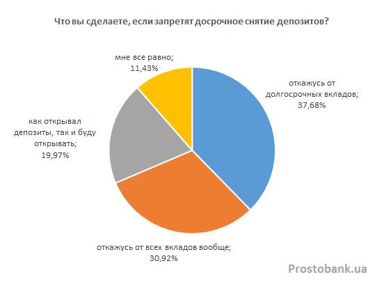 Однако вкладчики, в основном, придерживаются другой точки зрения. Так, по результатам опроса, проведенного на портале Prostobank.ua, более 30% всех опрошенных (192 респондента) считают, что вовсе откажутся от депозитов, если их нельзя будет снимать досрочно. Наибольшее же число опрошенных – 234 респондента или 38% - готовы отказаться от долгосрочных вкладов. При этом лишь 20% респондентов ответили, что будут размещать депозиты, как и ранее.