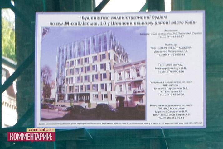 К закрытому строительной сеткой фасаду на ул. Михайловской, 10, киевляне давно привыкли. Но не исключено, что вскоре эти руины окажутся в центре общественного внимания: на объекте появилась информационная табличка, согласно которой по данному адресу должно появиться новое административное здание. От старинного здания XIX в. в эклектичном стиле с элементами барокко не останется даже упоминания: в самом центре столицы должен появиться очередной стеклянный уродец, возвышающийся над исторической застройкой города.