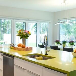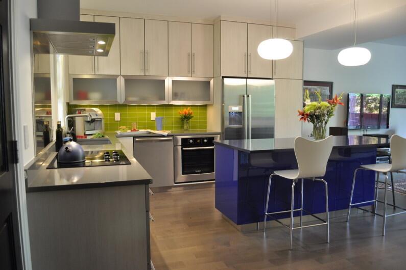 Итак, яркие оттенки зеленого цвета (салатный, цвет лайма, сине-зеленый) отлично подходит для оформления современных кухонь в стиле минимализм, хай-тек, супрематизм, контемпорари, которые предполагают использование прямых линий, четких форм и гладких поверхностей без явного декора. Тем не менее, слишком активно применять броские оттенки не рекомендуется, лучше ограничиться тем, чтобы использовать цвет на одном из уровней кухонной мебели, локально для покраски стены, напольного покрытия или защитного фартука.