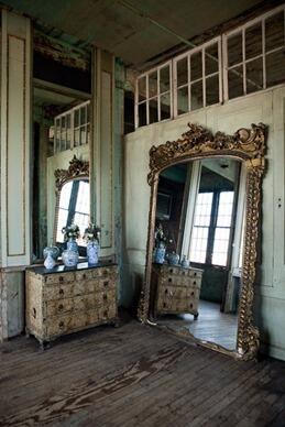В некоторых случаях зеркал может быть даже два: они образуют своеобразную композицию, диптих из рам, деля поверхность зеркала пополам. Вертикальные линии, образованные высокими рамами визуально делают потолки выше, а комнату просторнее.