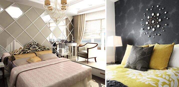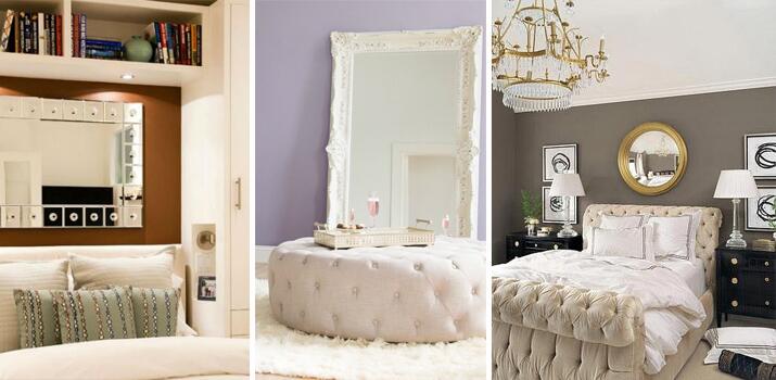 - украсить зеркалами произвольных форм в декоративных рамах стены, включая пространство над изголовьем кровати – зеркала при этом нужно размещать на уровне глаз или выше;