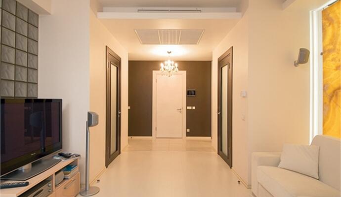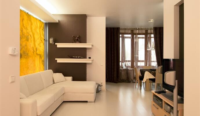 Кухня и гостиная, в свою очередь, не разделены практически ничем — это единое пространство, хотя и выстроенное двумя блоками. Есть особая территория кухни с обеденным столом, и особая зона отдыха с диваном, телевизором и «ониксом» — тем самым панно на стене, мимо которого не пройдешь равнодушно. В прихожей, напротив двери в гардеробную, есть дверь в ванную — небольшое «нежное» пространство, укомплектованное всем необходимым. Своеобразным автографом архитектора можно считать зеркало. Если в предыдущей квартире оно напоминало лунный диск, то здесь зеркало повторяет по форме главное украшение интерьера — панно. Светящийся ободок подчеркивает его четкий прямоугольник и заставляет сиять амальгаму. Еще одна сияющая деталь, которую нельзя не заметить — хрустальная люстра в зоне прихожей. Высоким (в буквальном смысле этого слова) гостям следует быть особенно внимательными.