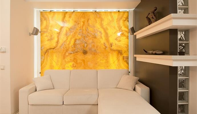 Эта квартира не велика, но главные два компонента в ней учтены. Основным ювелирным украшением пространства служит огромное панно из медово-золотистого оникса на одной из стен гостиной. Спрятанная подсветка заставляет его лучиться глубоким, драгоценным светом. За этим сокровищем скрывается еще одно — та самая заветная комната со стайками платьев на жердочках и целым выводком разноцветных сапожек и туфелек. По причинам застенчивости, а также ради сохранения приватности, здесь мы не снимали. Однако о размерах пространства можно судить и по фото: один вход в гардеробную сделан со стороны прихожей, второй — из спальни, вероятно, самой маленькой комнаты в квартире. От гостиной спальню отделяет легкая перегородка, а от кухни — подвижные панели раздвижных полупрозрачных дверей.