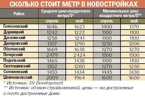 СНИЖЕНИЕ. В мае отмечалось незначительное снижение средних цен. Так, по данным информационно-аналитического портала «Столичная недвижимость», в мае, по сравнению с апрелем, стоимость квартир в новостройках Киева снизилась на 1,6% и составила 13 478 грн./кв. м. При этом за истекший месяц стоимость квартир в домах экономкласса снизилась на 0,7% — до 10 054 грн./кв. м; в домах бизнес-класса — снизилась на 0,2% — до 14 615 грн./кв. м; квартиры премиум-класса подешевели на 1,4% — до 22 722 грн./кв. м.