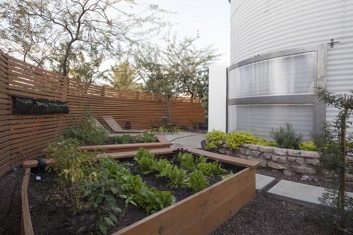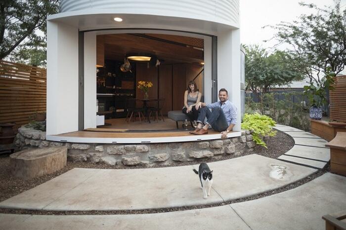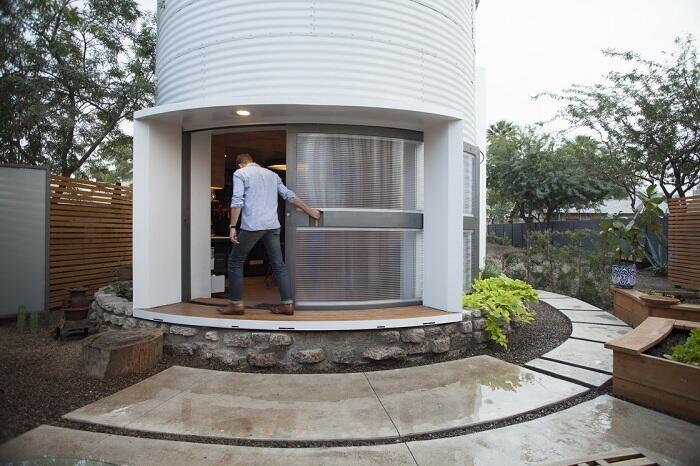Силос для хранения зерна, переделанный в жилище. Первоначальный фасад конструкции претерпел некоторые изменения: под заказ были сделаны округлые окна и двери, а гофрированная стальная обшивка перекрашена в белый цвет, чтобы отражать лучи палящего солнца. Часть интерьера выполнена из древесины грецкого ореха. «Теплые» оттенки добавляют уюта жилищу.
